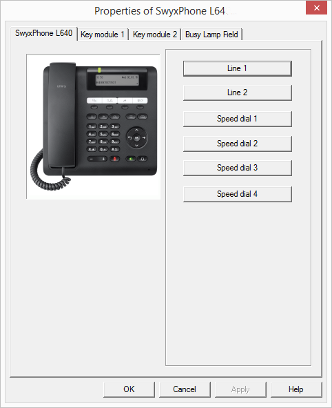 You will see a picture of the selected phone and the buttons, which are assigned to the keys on this phone. Click on a button to configure the corresponding key. The Properties page of the key will open.