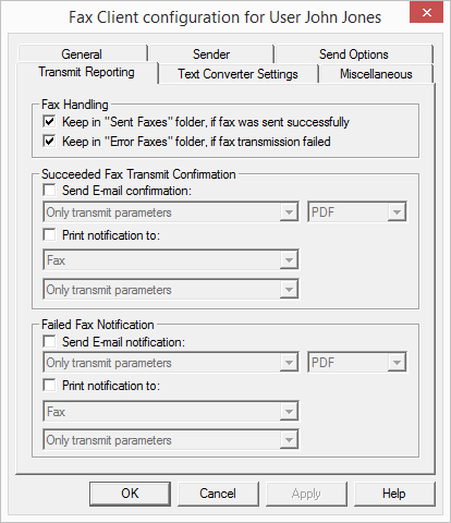 On the "Transmit Reporting" tab you can define the setting for the fax Send Report. If a fax is sent, the server returns a message about the success of the transmission. This may be a transmit confirmation (if the fax was transmitted successfully) or a notification (if errors occurred during fax transmission). You can define the form in which the Send Report is sent, namely per e-mail and/or in print form.