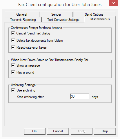 If you have faxes saved in the fax folders and these faxes are older than the number of days specified here, a window will appear when you start SwyxFax Client asking you to archive these documents. If you do not activate this option, the documents will not be archived.