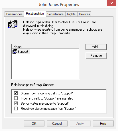 Here you can display the user groups the user is associated with and the call or status signaling defined for these group relationships. Relationships will be explained in detail in the following chapter on the subject of "Groups".