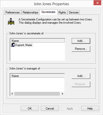 Here you can see which secretariate relationships are defined for this user. You will find information on the secretariate configuration in the chapter titled "Secretariate".