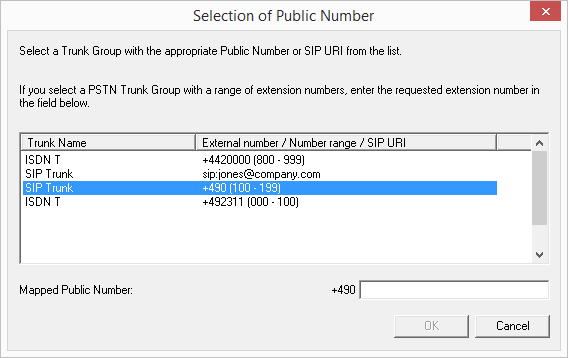 If the internal number is to be reachable from the public telephone network, it must be mapped to an external number. You can enter this public number directly in the field or click "Select...".