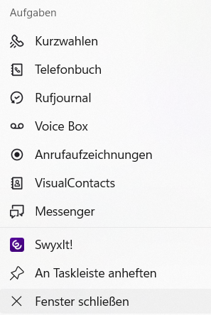 | Die Sprungliste können Sie auch bei geschlossenem SwyxIt! aufrufen, wenn das SwyxIt! Symbol an die Taskleiste angeheftet ist. |
