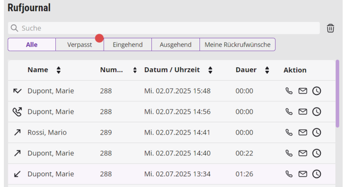 Im Rufjournal werden weitere Informationen zu den Anrufen aufgeführt: