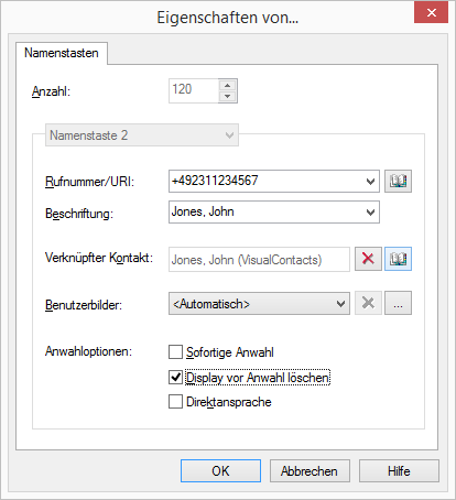 3 Geben Sie im Feld Rufnummer/URI die Standardrufnummer ein, die durch den Klick auf die Kurzwahltaste gewählt wird, (gültige Rufnummern sind z. B. Ziffernfolgen oder SIP-URIs)