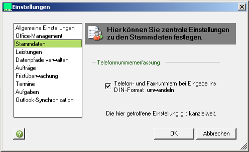 Nach der Installation müssen Sie im DATEV Arbeitsplatz unter Extras | Einstellungen | Stammdaten die Option Telefon- und Faxnummern bei Eingabe ins DIN-Format umwandeln aktivieren: