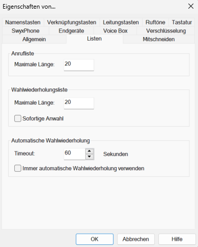 Mit Hilfe dieser Registerkarte konfigurieren Sie die Anrufliste und das Verhalten der Wahlwiederholung.