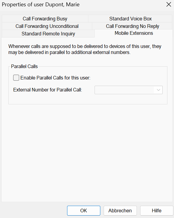 3 Activate the checkbox Enable Parallel Calls for this user, if your incoming calls should also be signaled to another external device.