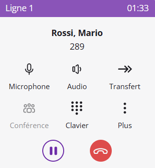 Lorsque vous recevez ou lancez un appel, le contrôle d'appel intégré apparaît en dessous des lignes. Vous y trouverez différentes options pour gérer l'appel. Cliquez sur une ligne pour afficher le contrôle d'appel correspondant.
