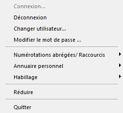 Changer d'utilisateur | Cette option permet de changer le compte d'utilisateur avec lequel vous êtes connecté. Si vous travaillez avec plusieurs comptes d'utilisateurs SwyxWare lors de l'authentification Windows, vous pouvez sélectionner un autre compte utilisateur lors de la connexion. Lorsque vous connectez avec vos données d’utilisateur de SwyxWare, vous pouvez téléphoner avec votre compte SwyxWare depuis un autre poste de travail, indépendamment de la connexion à Windows. Voir aussi 2.7 Changer d'utilisateur. |