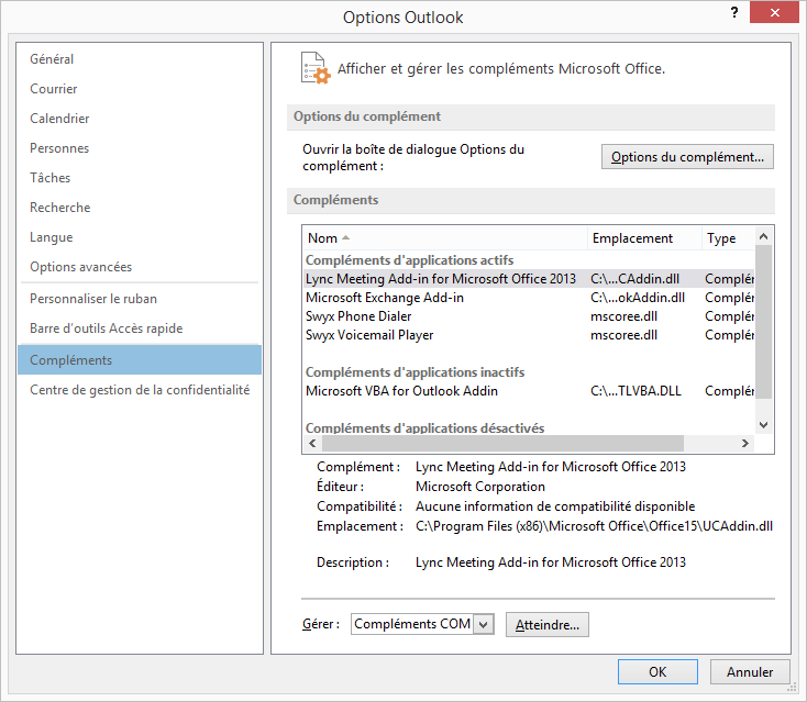 La boîte de dialogue Options de complément s'ouvre.