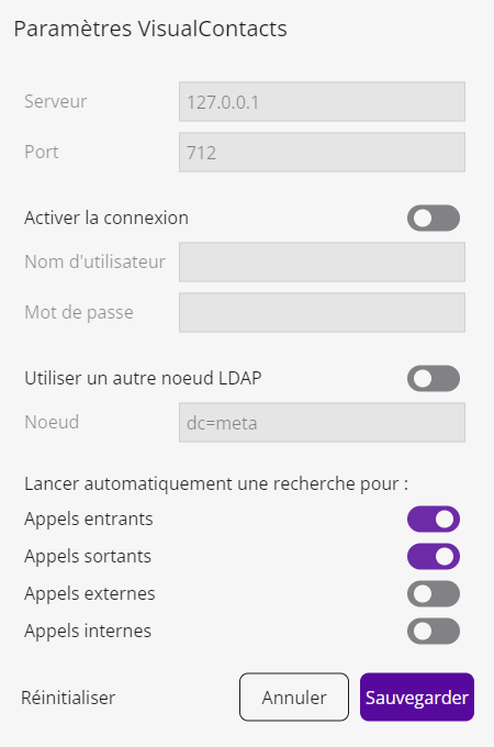 Pour permettre l'accès au ESTOS MetaDirectory ou C4B XPhone Connect Directory par le SwyxIt!, les paramètres d'accès du serveur LDAP devront être indiqués dans l'onglet « VisualContacts ».