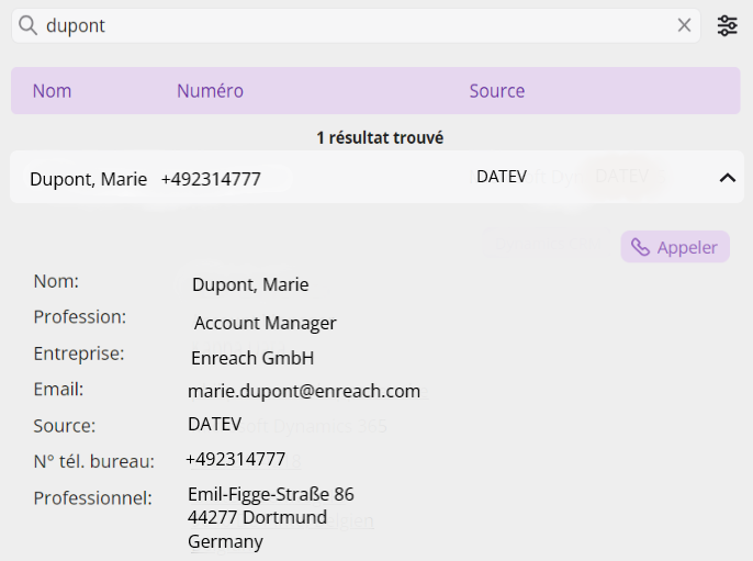 Pour de plus amples informations sur les critères de recherche, consultez la documentation d'ESTOS MetaDirectory ou C4B XPhone Connect Directory.