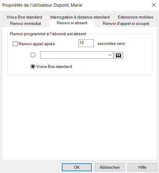 Si vous avez configuré un renvoi vers votre Voice Box standard, les options définies dans l'onglet Voice Box standard sont utilisées.