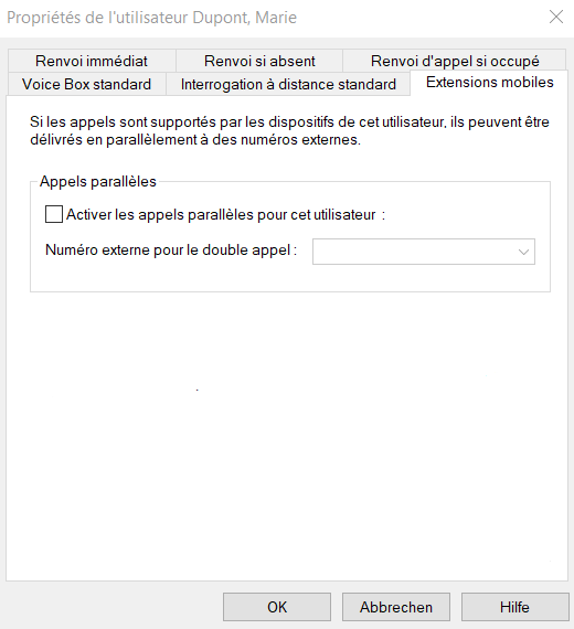 L'onglet Extensions mobiles permet de définir une signalisation d'appels sur un appareil externe.
