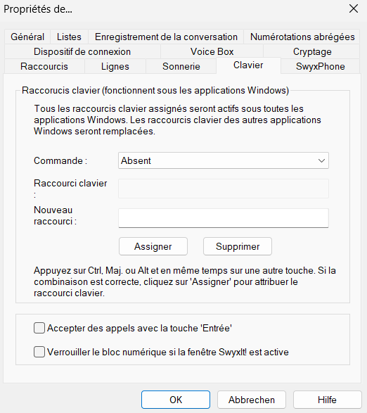 L'onglet Clavier permet de définir des raccourcis clavier individuels pour les fonctions les plus importantes de SwyxIt!.
