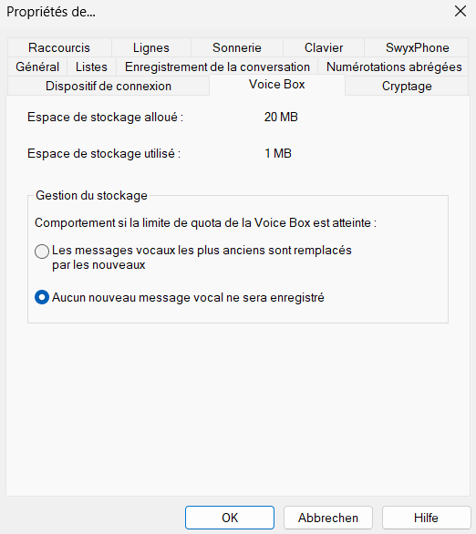 Sous l'onglet Voice Box, vous pouvez voir les informations sur l'espace de stockage des messages vocaux et définir le comportement à adopter lorsque la limite de quota est atteinte. Pour gérer l'espace de stockage, vous disposez des options suivantes :
