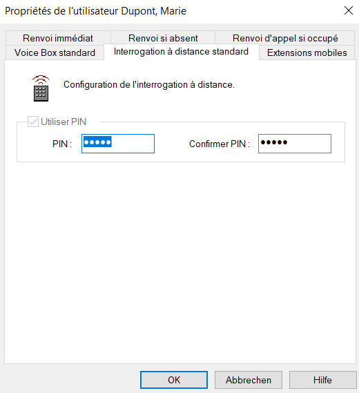 Vous pouvez définir cette interrogation à distance spéciale dans le Call Routing Manager si votre administrateur vous a accordé les droits nécessaires. Vous pouvez ainsi utiliser un autre menu d'interrogation à distance avec un mot de passe particulier. L'interrogation à distance standard n'en est pas modifiée pour autant. Voir aussi help.enreach.com/cpe/latest.version/CRM/Swyx/en-US/index.html#context/help/standard_remote_inquiry_$.