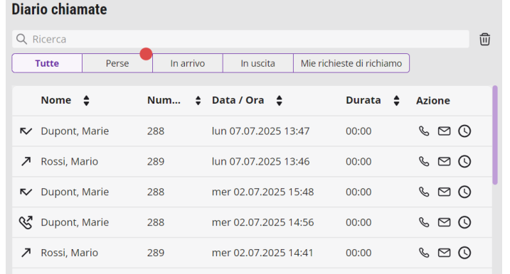 Le chiamate elencate nel diario chiamate sono accompagnate da importanti informazioni indicate direttamente negli elenchi; sono anche disponibili diverse funzioni per la gestione delle chiamate. Ad esempio è possibile chiamare un utente direttamente da questi elenchi o copiare il numero nella rubrica personale.