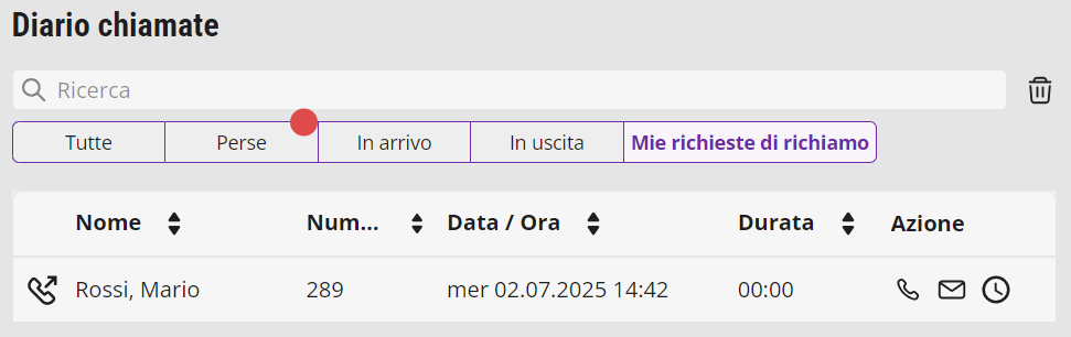 Richieste di richiamata depositate da altri utenti vengono invece memorizzate nell'elenco Tutte o Perse. Un cerchio rosso sul tasto funzione Giornale delle chiamate e sull'elenco delle chiamate perse indica che è stata presentata una richiesta di richiamata.