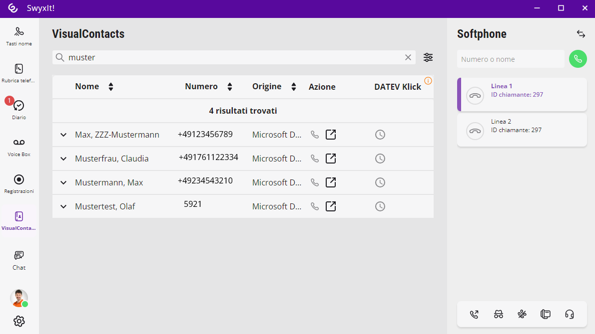 Swyx VisualContacts serve per ricercare contatti in fonti dati predefinite. Inoltre, con chiamate in arrivo e in uscita, SwyxIt! rileva automaticamente i contatti memorizzati nella ESTOS MetaDirectory o C4B XPhone Connect Directory in base al numero telefonico e li visualizza sulla scheda “VisualContacts”.