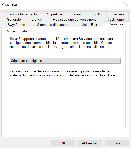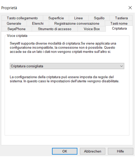 Le conversazioni non vengono codificate e sono in chiaro. Se questa casella è disattivata, l'amministratore ha scelto questa modalità già nell'ambito dell'impostazione globale dello SwyxServer.