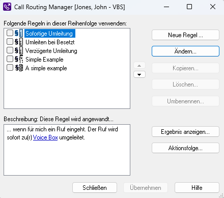![]() | Systemregel Diese Regeln werden von SwyxWare vorkonfiguriert bereitgestellt. Die Parameter können Sie auch direkt in SwyxIt! Classic bei Ihren Umleitungen festlegen. „Sofortige Umleitung“, „Umleiten bei Besetzt“, „Verzögerte Umleitung“ |