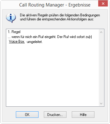 Es erscheint das Fenster „Call Routing Manager - Ergebnisse“.