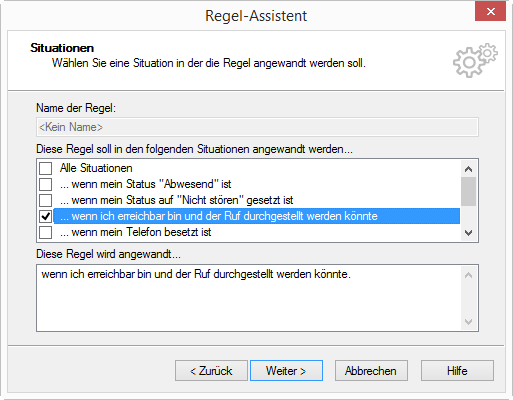 1 Aktivieren Sie unter „Diese Regel soll in den folgenden Situationen angewandt werden...“ das Kontrollkästchen der gewünschten Situation mit einem Klick.