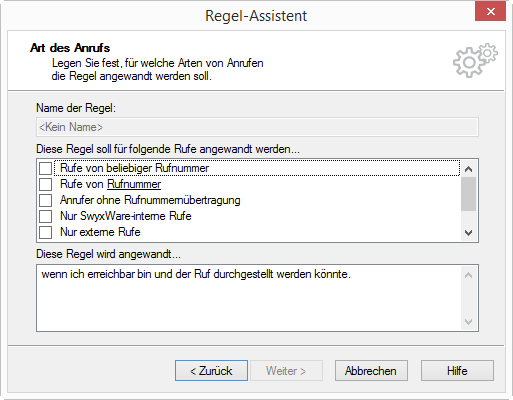 Im Fenster „Regel-Assistent - Art des Anrufs“ legen Sie weitere Bedingungen fest.