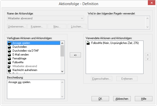 Das Fenster zeigt eine Aktionsfolge. Links oben in der Dropdownliste „Name der Aktionsfolge“ sehen Sie den Aktionsfolgenamen. Die Dropdownliste ist deaktiviert, wenn Sie dieses Fenster aus dem Regel-Assistenten heraus aufrufen. Rechts oben, unter „Wird in den folgenden Regeln verwendet“, werden alle Regeln aufgeführt, die diese Aktionsfolge benutzen.