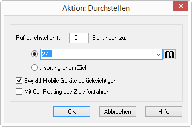 Die Aktion „Durchstellen“ stellt den Anruf an die Zielrufnummer durch. Ein Zeitlimit (Timeout) begrenzt den Zeitraum, in dem versucht wird, eine Verbindung aufzubauen.