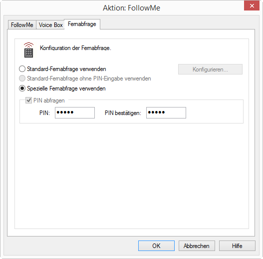 16 Legen Sie fest, ob Sie Ihre normale Standard-Fernabfrage (mit oder ohne PIN-Eingabe) verwenden oder ob Sie für diese Aktion eine spezielle Fernabfrage (z. B. mit einer anderen PIN) definieren möchten: