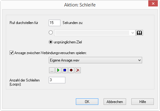 Mit dieser Aktion wird wiederholt versucht, einen Anruf an eine bestimmte Zielrufnummer durchzustellen. Zwischen den einzelnen Versuchen wird dem Anrufer eine weitere Ansage eingespielt, bei Besetzt eine durch den Systemadministrator festgelegte Besetzt-Ansage.