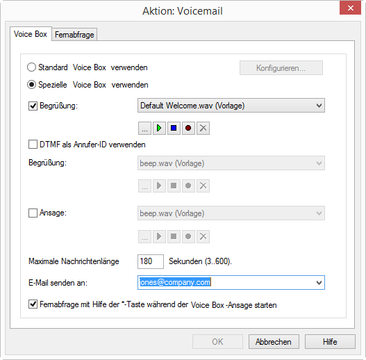 Die Parameter der Voice Box-Aktion, z.B. der Begrüßungstext und die Länge der Aufnahme, die hier festgelegt werden, verändern nicht die Einstellungen der Standard Voice Box. In dieser Voice Box können Sie z.B. speziellere Ansagetexte wählen.
