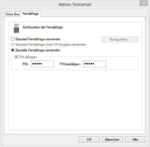 9 Legen Sie fest, ob Sie Ihre normale Standard-Fernabfrage (mit oder ohne PIN-Eingabe) verwenden oder ob Sie für diese Aktion eine spezielle Fernabfrage (z. B. mit einer anderen PIN) definieren möchten: