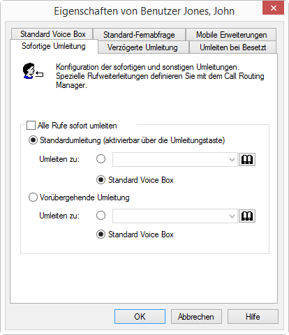 Haben Sie auf Ihre Standard Voice Box umgeleitet, so sind die Einstellungen aktiv, die Sie auf der Registerkarte „Standard Voice Box“ festlegen.