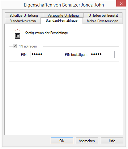 Konfigurieren Sie die Standard-Fernabfrage innerhalb einer Umleitung bzw. Systemregel, so wird die Benutzer-PIN immer abgefragt, ein Kontrollkästchen hierfür existiert nicht. Rufen Sie von Ihrer eigenen Durchwahl aus an, für die diese Umleitung konfiguriert wurde, so wird die Benutzer-PIN nicht abgefragt.