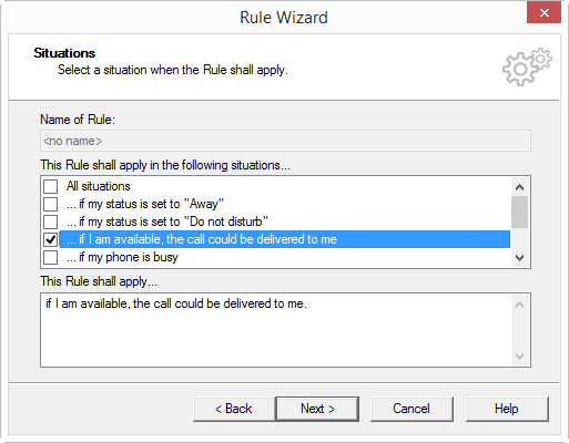 This is how you modify a user rule) the Rule Wizard will open. If you click on "Next>" you will move on to the "Situations" window. Here you describe under what circumstances the rule should be applied. All allowed situations, i.e. the system situations, are listed under "This Rule shall apply under the following situations…". A rule can be applied to different situations. Situations which have already been selected are shown with a check mark.