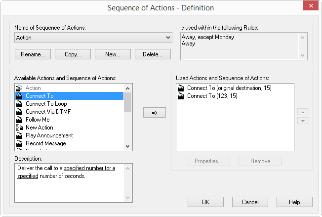 The window shows a sequence of actions. In the upper left of the "Name of Sequence of Actions" drop-down list you will see the sequence of actions name. The drop-down list is deactivated if you call this window from within the Rule Wizard. All of the rules, which use this sequence of actions, are listed in the upper left under "is used within the following rules".