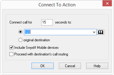 The "Connect to" action transfers the call to the destination number. A time limit (Timeout) limits the time period in which a connection establishment it is tried.