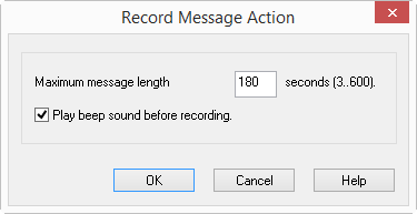 The action "Record Message" records the caller’s message. The recording time can be limited (Timeout) so that the resulting file does not become too large. The voice message is saved linked to this call.