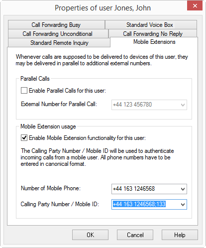 3 Activate the checkbox "Enable Mobile Extension functionality for this user". This option is only available to you if the administrator has appropriately set up the use of SwyxIt! Mobile and the mobile extensions.