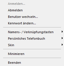 Kennwort ändern... | Wenn Sie nicht Ihre Windows-Anmeldung zur Anmeldung an SwyxServer verwenden, können Sie hier Ihr Kennwort für die Anmeldung am Server ändern, siehe 3.5 Kennwort ändern. Diese Option ist nur verfügbar, wenn Sie mit einem SwyxWare Benutzernamen und Kennwort angemeldet sind. |