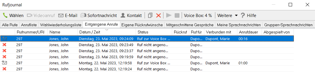 1 Doppelklicken Sie auf das Symbol im Windows-Infobereich bzw. klicken Sie auf die Funktionstaste „Rufjournal“ und wählen Sie die Registerkarte „Entgangene Anrufe“, um die Liste der entgangenen Anrufe anzuzeigen. Alle neuen entgangenen Anrufe werden in der Liste fett markiert dargestellt.
