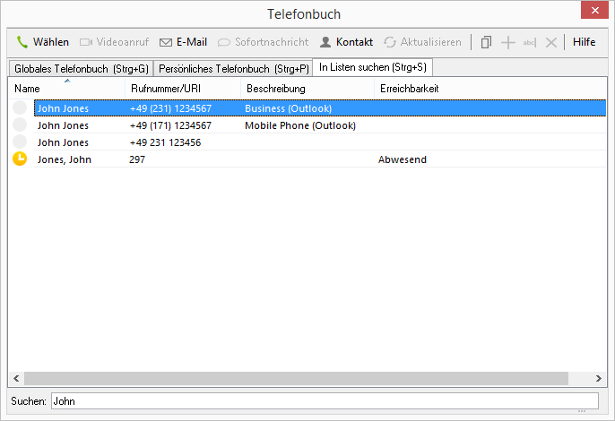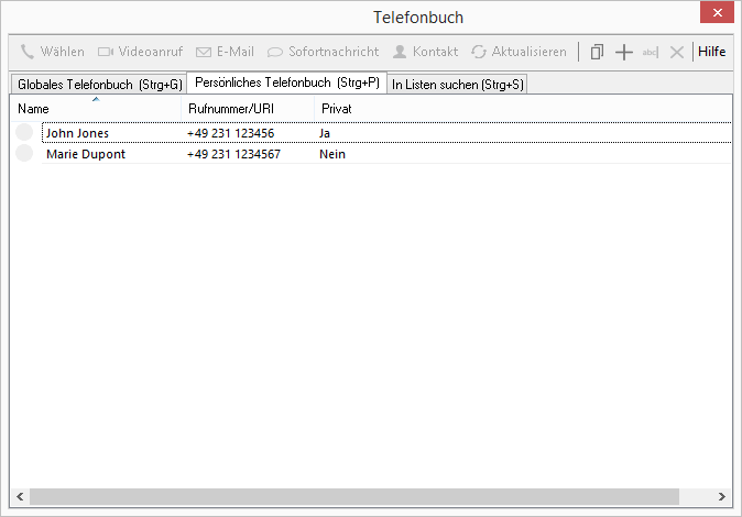 2 Klicken Sie auf die entsprechende Registerkarte, um das zu verwendende Telefonbuch auszuwählen (global oder persönlich). Sie sehen eine Liste der im Telefonbuch gespeicherten Einträge sowie die Statusanzeige für die jeweiligen Teilnehmer. Sie haben auch die Möglichkeit, einen Teilnehmer über die Suchfunktion zu finden, siehe