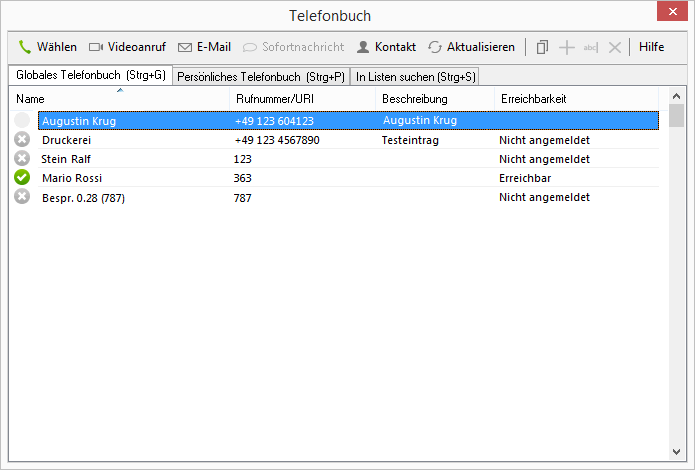 Wenn Sie über die Berechtigung zum Ändern des Globalen Telefonbuch verfügen, sehen Sie im Globalen Telefonbuch neben der Rufnummer, Beschreibung und Erreichbarkeit auch, ob der Eintrag von Ihnen editiert werden kann und ob er für Benutzer, die nicht über die Berechtigung zum Ändern des Globalen Telefonbuchs verfügen, sichtbar ist.