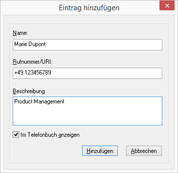 Wenn Sie das Globale Telefonbuch ändern, können Sie beim Anlegen oder Ändern eines Eintrags außerdem eine Beschreibung eingeben. Diese wird dann im Globalen Telefonbuch in der entsprechenden Spalte angezeigt. Außerdem können Sie über das Kontrollkästchen „Im Telefonbuch anzeigen“ festlegen, ob der Eintrag nicht für alle Benutzer sichtbar sein soll. Benutzer, die die Berechtigung haben das Globale Telefonbuch zu ändern, sehen diesen Eintrag allerdings immer (mit dem Vermerk „Ausblenden“ in der Spalte).