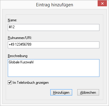 Im Globalen Telefonbuch können auch Kurzwahlen hinterlegt werden, die alle Benutzer dieses Servers nutzen können. Dabei wird statt eines Namens eine Kurzwahl (z.B. #11) hinterlegt und mit einer Rufnummer verknüpft.