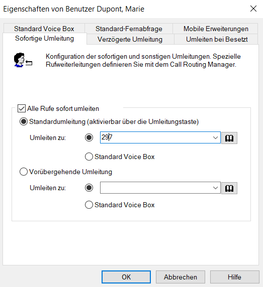 Wenn Sie die sofortige Umleitung mit der Option „Alle Rufe sofort umleiten“ aktiviert haben, können Sie außerdem definieren, ob Sie einmalig an einen anderen Teilnehmer umleiten möchten (vorübergehende Umleitung) oder Ihre Standard-Umleitung benutzen möchten: